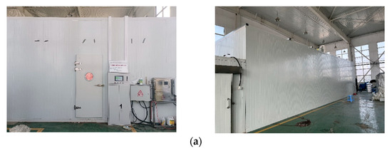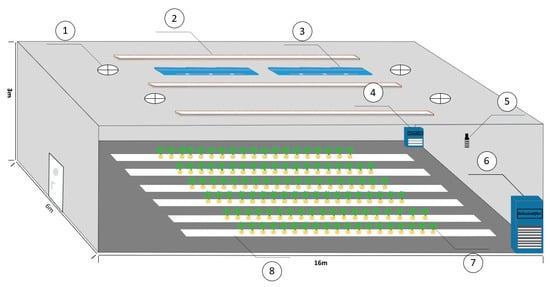 This paper focuses on a closed artificial light plant factory located in Liaoning province, China. The structure of this plant factory is made up of PVC panels and has a total volume of 16 m × 6 m × 3 m. Figure 1 shows the architecture of the plant factory, which includes a cultivation rack consisting of six columns of 14 m × 0.2 m × 0.2 m each. Instead of natural light, the plants in the factory are illuminated with LED lamps, the activation of which is adjusted according to the light needs of the crops. To prevent any risk of burning or scalding, the cultivation racks are positioned at a safe distance of 1.5 m away from the LED light source for crop cultivation. Additionally, a high-throughput plant imaging system measures the leaf area of the crops.