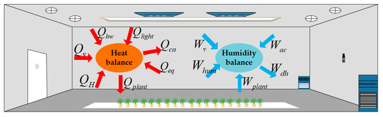 A schematic diagram of the energy balance of the plant factory has been drawn according to various dynamic environmental conditions that may be encountered in the plant factory, as shown in Figure 3. Inspired by the literature [31] and based on the first law of thermodynamics, the heat balance and humidity balance of the plant factory are established and expressed by Equations (1) and (2).