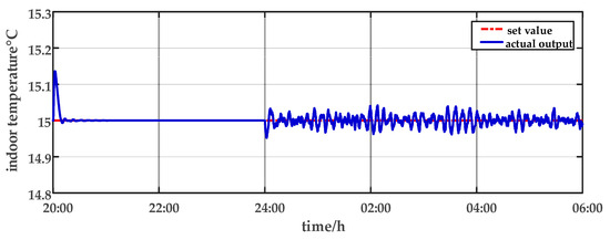 For comparison, the traditional PID control method is adopted. The control effect of temperature tracking using the traditional PID control strategy is shown in Figure 7, and the control result of temperature using the traditional PID control strategy in parameter uncertainty experiment and multi-disturbance experiment is shown in Figure 8. The control effect of humidity tracking using the traditional PID control strategy is shown in Figure 9, and the control result of humidity using the traditional PID control strategy in parameter uncertainty experiment and multi-disturbance experiment is shown in Figure 10. Figure 11, Figure 12, Figure 13 and Figure 14 show the corresponding responses of control inputs using the traditional PID control strategy. The control effect of temperature tracking effect by nonlinear adaptive decoupling control strategy is shown in Figure 15, and the control result of temperature by nonlinear adaptive decoupling control strategy in parameter uncertainty experiment and multi-disturbance experiment is shown in Figure 16. The control effect of humidity tracking by nonlinear adaptive decoupling control strategy is shown in Figure 17, and the control result of humidity by nonlinear adaptive decoupling control strategy in parameter uncertainty experiment and multi-disturbance experiment is shown in Figure 18. Figure 19, Figure 20, Figure 21 and Figure 22 show the responses generated by the control inputs when using a nonlinear adaptive decoupling control strategy.