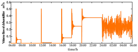 Volume flow rate of dehumidifier () under the nonlinear adaptive decoupling control strategy.