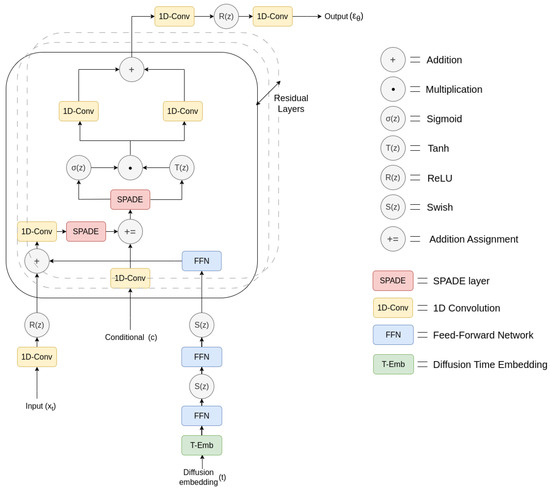 The proposed model architecture DSAT (Diffusion State Space Augmented Transformer)-ECG takes inspiration from the SSSD-ECG [29] architecture, which is based on DiffWave, i.e., a diffusion-based model for audio synthesis [39]. In this improved design, the S4 [35] has been substituted with SPADE [27] layers. These SPADE layers now function as diffusion layers within every residual block, seamlessly integrating the diffusion embedding. Furthermore, the conventional second S4 layer has been replaced by an additional SPADE layer, which is seamlessly integrated after the addition assignment, along with conditional information. The model architecture is depicted in Figure 2.