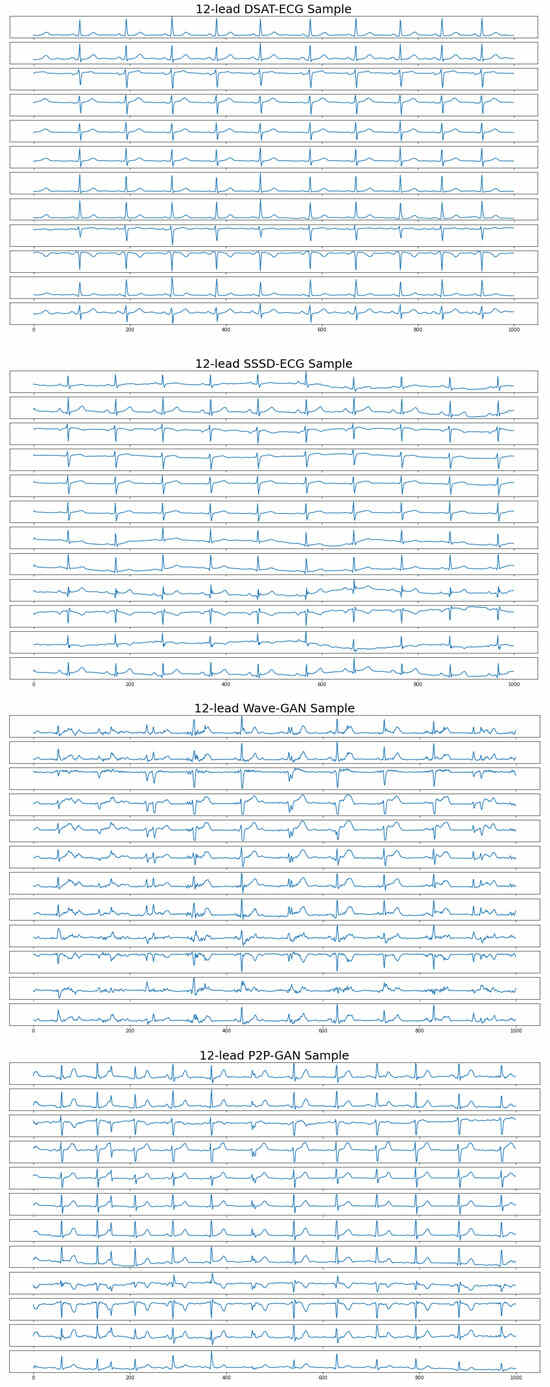 In this section, we describe the process through which we conducted a comprehensive assessment of the proposed model’s quality and authenticity, drawing inspiration from the evaluation approach used in [32]. The evaluation involved a direct comparison between the proposed model and several other existing models that were proposed in [29], namely SSSD-ECG, WaveGAN, and P2PGAN. We sought to offer a comprehensive perspective on how our model showcases advancements over existing methodologies, highlighting its promising implications, particularly in the realm of ECG synthesis. Figure 3 shows a 12-lead ECG sample generated by different models.