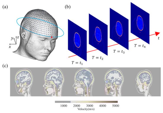 Subsequently, a numerical simulation database is established as the data labeled to train the network [42]. Figure 1 depicts the geometry of the wavefield forward modeling and the simulation. In this study, we employ a model derived from the MIDA model developed by Iacono et al. [43]. As illustrated in Figure 1a, sensors are placed around the brain, and the 3D physical model is converted into the acoustic model based on the physical acoustic dataset developed by Batalla et al. [44]. The simulated wavefield snapshots at different times are presented in Figure 1b. All transducers are employed to record the wave signals around the brain model at each excitation. It is important to note that our approach in this study does not involve the use of an ultrasonic focusing transducer array or algorithms for 3D imaging in subsequent experiments, which is different from traditional transcranial ultrasound.