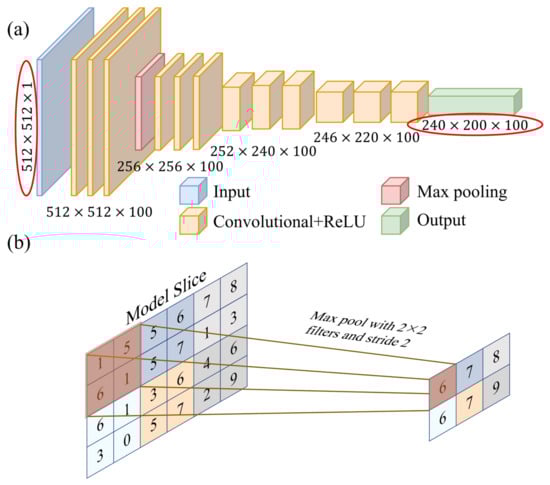 where represents the convolution result, represents the activation function, represents the weight of the convolution kernel on row and column of , is the input layer, and is the bias. The convolution process enables the feature extraction of the input layer image.