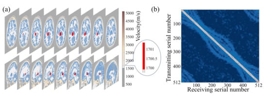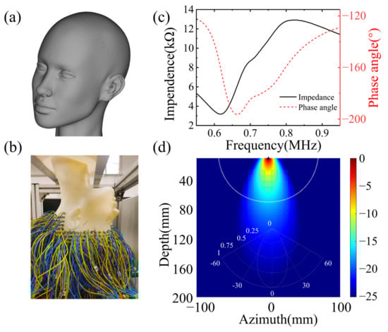 The wavefield data were acquired utilizing a 512-channel transducer array, securely affixed around the phantom with rapidly polymerizable adhesive, based on ethyl cyanoacrylate, ensuring a close fit between the phantom and transducer, thereby resulting in higher signal-to-noise ratio data. The sensor unit, arranged in layers from top to bottom of the human brain, comprises a cylinder with a diameter of 5 mm, functioning as an acquisition unit, rather than a storage unit. The impedance measurement of the sensor unit is illustrated in Figure 9c. The center frequency of the sensor unit is 0.721 MHz, with a −3 dB bandwidth of 0.276 MHz. The electromechanical coupling coefficient is 0.577. The directivity is depicted in Figure 9d. The spacing between layers is 10 mm, with each layer of the sensor unit arranged at an equal angle, thereby facilitating the collection of a full range of wavefields across the brain and providing signals with more information about tissue distribution in the brain [31]. The 512-channel ultrasonic transducer is driven by the UTA-1024-MUX panel of the American Verasonics company (Kirkland, WA, USA), with the precise positioning of transducers to the phantom known. The excitation signal, a Ricker wavelet signal with 10 periods, is used to stimulate the transducers, with a center frequency of 700 kHz, and the excitation signal and frequency contents are illustrated in Figure 4a,b.