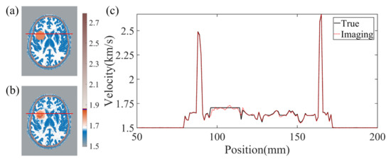The effectiveness of BIFCN in reconstructing the brain cross-section is vividly presented in Figure 5. Specifically, Figure 5a displays the ground truth velocity map of the test sample, while Figure 5b depicts the reconstructed results of BIFCN. Our results showcase the remarkable accuracy of BIFCN, with a phenomenal PC of 99.95332%. Further analysis of the extracted regions from Figure 5a,b reveals that the velocity fluctuation between the reconstructed and true velocity is minimal and stable. This remarkable stability indicates that BIFCN has great potential for accurately reconstructing complex brain models.