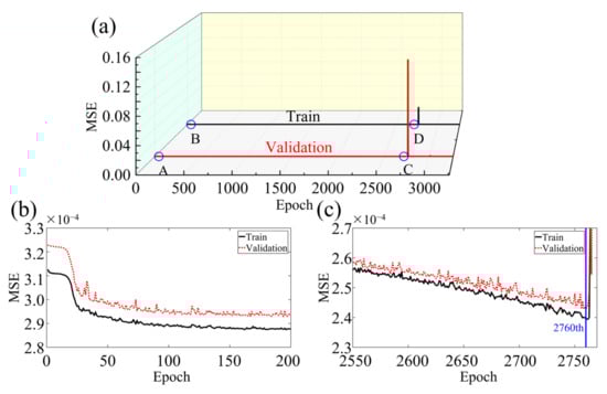 To optimize performance based on hardware resources, the batch size, the total epoch, and the early stopping epoch are respectively specified as 8, 5000, and 500. This means the training termination condition is either when the program training epoch reaches 5000 or when the training loss function results stop decreasing within 500 epochs. The optimal network achieved is either the model with the lowest MSE that does not change within the early stopping epoch or the last model that reaches the total epoch. The training and validation sets are randomly divided during the training process to improve the robustness and generalization of the network structure [50].