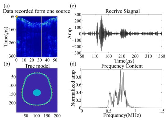 Although sub-MHz frequency signals have proven to be more readily penetrable through the brain and provide higher signal-to-noise ratios, they result in a compromise in imaging resolution. Figure 10a presents the true wavefield data recorded by 54 sensors in the set transducers array, distributed around the brain phantom from a single excitation source located in the yellow circle. Figure 10c,d show the time domain signal and frequency content recorded by the single receiver opposite the source, with the data displayed indicated by the yellow line. The signal possesses a good signal-to-noise ratio when penetrating the phantom, which aligns with experimental experience. The signal-to-noise ratio of the amplitude of the first arrival signal and the noise was computed, displaying 17 dB. The single acquisition process was repeated 512 times, and the time domain signal acquisition of one position was accomplished. The clot phantom is controlled by a 3D coordinate machine to move to a fixed position, with the wavefield collected to establish a database. Figure 10b illustrates the transducer section and the position of the wavefield shown in Figure 10a.