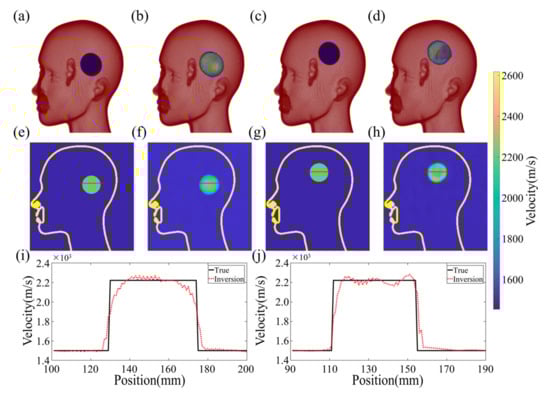 The fundamental principle of the algorithm is to establish a coherent mapping between the experimental observations and the 3D velocity model to generate a smooth transition at the clot’s boundary without any sudden velocity changes. The process is illustrated in Figure 11i,j, where slicing a 1D velocity profile from the 2D velocity distribution results in jagged variations in velocity within the clot. This is because it is challenging to identify a continuously differentiable function that precisely matches the theoretical model of uniform velocity distribution. The PC of the test sample between the reconstructed and true images on the 3D structure depicted in Figure 11 is 92.16076%, demonstrating the effectiveness of the proposed algorithm.