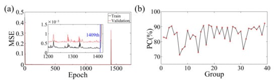 During the training phase, a total of 57 training samples and 19 verification samples were employed to facilitate the offline training of the network structure. It is noteworthy that the hyperparameters were kept unchanged throughout the training process, in line with the simulation settings. Additionally, the initial weight of the network structure’s parameters was randomly set between 0 and 1. Once the training was accomplished, the performance of the network structure was evaluated by subjecting 19 test sets to online testing, and the reconstructed results were evaluated using the PC, a reliable measure of accuracy.