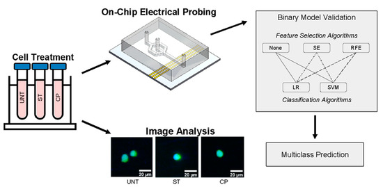 Machine learning (ML) has been applied to clinical cancer identification based on nucleus properties in both genetic and histological image data to improve the speed and accuracy of both diagnosis and prognosis [20,21]. ML offers the benefit of incorporating various techniques to determine the most important features and appropriate diagnosis or prediction algorithms based on the problem at hand and being adaptable for larger datasets. For examination of single cells, recent studies have built classification models, such as support vector machine (SVM), gradient boosting (GB), k-nearest neighbor (KNN), and random forest (RF) with cell micrographs to identify the differentiation within a population of cells [22,23]. Similarly, apoptotic cell identification has been applied to single cells using fluorescence-based flow cytometry employing KNN, RF, SVM, and logistic regression (LR) classifiers [24]. The use of lab-on-a-chip set-ups combined with ML poses an interesting solution for examining overlapping populations of single cells which may be difficult to distinguish using traditional statistical analysis. This combination also promises to improve system integration, wherein clinical diagnosis could become more rapid, accurate, and require less resources. In recent years, this combination between ML and electrical data has been increasingly applied to classification tasks in various cell studies including cell type identification [25,26,27], cancer cell typing [28,29], and monitoring cell viability during treatment [30]. While SVM and LR remain some of the most commonly seen classifiers, typically a variety is used in each study considering the performance of classifiers is particularly dataset dependent [31]. Such classifier improvement can also be controlled using feature selection techniques and tuning parameters such as the regularization parameter in SVM or LR [32,33]. Especially in cases of high feature dimensionality, several recent diagnostic sensors using an e-nose paradigm emphasize the importance of feature selection methods to improve ML classification accuracy to refine the variables collected in future designs [34,35].