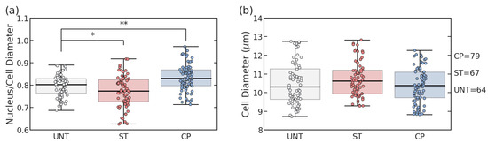 Cell and nucleus diameter measurements from fluorescence imaging. (a) Nucleus/cell diameter ratios among untreated, staurosporine (ST), and ciprofloxacin (CP) treated Jurkat cells. (b) Population cell diameter comparison among treatment types. (* p < 0.05, ** p < 0.01) Each box demonstrates the interquartile range (IQR) for the sample and the whiskers show the extension to 1.5 * IQR.