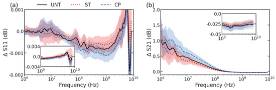 Swept spectra showing mean (lines) and standard deviation (shadows) for (a) ΔS11 and (b) ΔS21. UNT cells are shown using black with a gray shadow, ST−treated cells are shown using red line and shadow, and CP−treated cells are shown using a blue line and shadow.