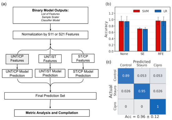 To build upon the success of the binary classification schemes, a major voting approach was developed based on the predictions each binary classifier would produce for each cell in the dataset. While the same overall structure was maintained, the predictions of each classifier were considered to generate a final multiclass prediction if each cell was UNT-, ST-, or CP-treated, as shown in Figure 5a. The prediction process using major voting was completed for each combination of feature selection method and classifier, showing more success in the case of RFE than SE (Figure 5b). In this case, the error bars are contingent on the predictions made by the binary classifiers but the same pattern of reduced error bar size with feature selection is observed. The multiclass prediction method exemplified that using feature selection to focus on relevant features as the basis of classification, most of which occur in the 100-MHz to 9-GHz range, there can be a 96% classification accuracy among all three classes, especially in identifying ST- or CP-treated cells (Figure 5c). The major voting approach also showed much higher prediction accuracy when compared to training a multiclass classifier among the three classes.