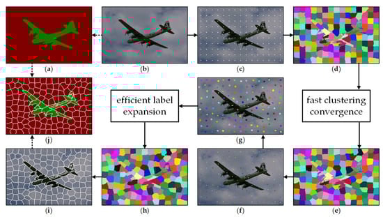 In practice, there is a post-processing step before cluster regions become superpixels in SLIC. Theoretically, other than geodesic distance, the proposed correlation measurement in Equation (1) cannot guarantee the spatial connectivity of pixels with identical labels []. For example, in Figure 3a,b, pixels on the tail of the airplane are discrete, especially on logo A. As a result, superpixels described by these clusters are spatially tangled (Figure 3d). In contrast, the merging operation could enforce spatial compactness. Nevertheless, it loses the detailed information, which results in content heterogeneity (Figure 3e,f). In fact, the process is rigid, wherein an isolated pixel is directly absorbed by its largest adjacent superpixel without correlation assessment.