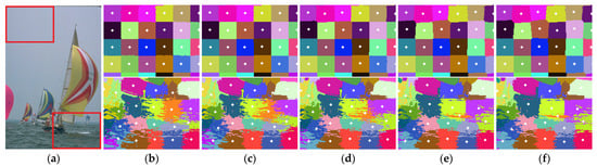 Visual comparison of clustering results by SLIC. (a) Input image; (b–f) Alternating columns show the zoom-in results of (a) after different iteration times, wherein the upper and lower column represent the label distribution within the top-left and bottom-right rectangle, respectively; (b) 1 iteration; (c) 2 iterations; (d) 3 iterations; (e) 5 iterations; (f) 10 iterations.