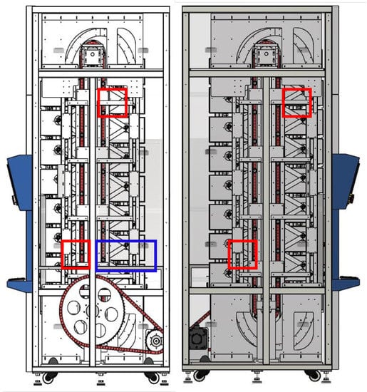 Furthermore, even if the number of sensors is known in advance, different methods can be employed in succession; the increased processing time in this scenario is insignificant. It is recommended to compare data acquired in various vibration settings once sensors are mounted at optimized spots []. Interestingly, Figure 5 and Figure 6 show the practical application and guide for the sensor placement. These have helped in the vibration-data acquisition process with the areas marked in blue and red boxes. With the SAR 400 being a ready-made product, the researchers were unable to place the vibration sensors as illustrated by the modelling result. Hence, the vibration sensor were placed close to the identified blue and red boxes. Looking closely, the vibration sensors were placed at the red box in the two figures (see Figure 5 and Figure 6) for better understanding while the blue box (see Figure 5 is left out of the vibration position based on the knowledge wise. Table 2 describes the dimension for the vertical carousel storage and retrieval system (VCSRS) produced by the Instern company, South Korea. Owing to the size of the product under study, the best pictorial view of the vibration sensors is shown in Figure 6, avoiding damages to the SAR 400 model.