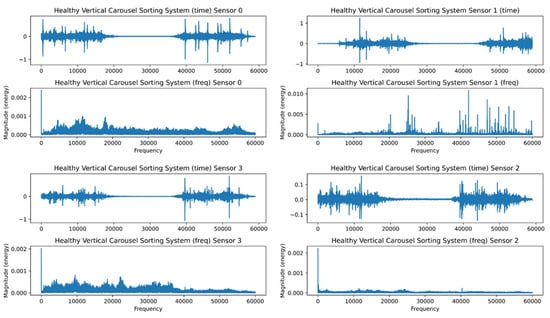 The FFT’s inability to recognize transients or brief spikes in the signal is its second drawback. They typically have low energy and a broad frequency band. Transients’ energy is dispersed throughout a wide frequency range when converted into the frequency domain. Because of their low energy, it is impossible to detect transients in the frequency domain. Figure 7 and Figure 8 depict the healthy and faulty vibration data for the four installed sensors in the VCSRS, respectively. The sensors were labeled from 0 to 3, with 0 representing the first sensor, 1 representing the second sensor, 2 representing the third sensor, and 3 representing the fourth sensor. On each plot are the time-domain and the frequency-domain plots, with the same for the faulty vibration dataset. There were noticeable transients in sensor 1 compared with the other three sensors under the healthy vibration data. There were significant transients and spikes for all sensors in the faulty dataset.