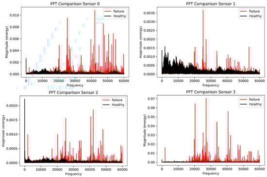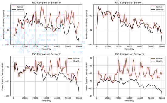 Figure 9 shows the comparison of the fast Fourier transform plot for both the healthy and faulty vibration datasets. Interestingly, the healthy dataset was colored in black and the faulty dataset was colored in red for all four plots. Sensor 0 shows significant transients for the faulty data compared with the healthy data, while sensor 1 had little transients for the healthy data but transients and spikes at 30,000 Hz compared with sensor 0 which had transient behavior at the tail end of the frequency plot. However, sensors 2 and 3 have evenly spaced spikes for the faulty data, while the healthy data have low energy for both sensors. Due to the setback of the FFT, we deployed the power spectral density to analyze the vibration data for the four sensors. Figure 10 displays the power spectral density plot with all sensors exhibiting significant behavior to distinguish the two datasets. With the FFT, we could not compare and quantify the vibration data, and PSD has been able to do justice to it.