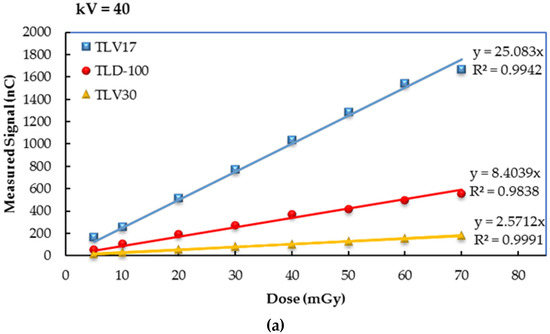 The dose–response linearity for TLV17, TLV30 and TLD-100 from SSDL daignostic X-ray beams. (a) KV = 40, (b) KV = 80, (c) KV = 100, (d) KV = 120, (e) KV = 150.