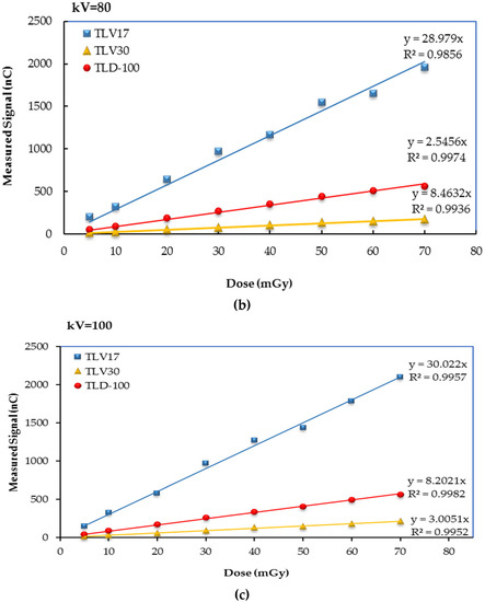 The results show clearly that TLV17 and TLV30 dosimeters have, respectively, the highest and lowest sensitivity compared with TLD-100. This is because the TL response was influenced by the crystal sizes and its crystallinity percentage in the amorphous state. All the dosimeters showed good dose–response linearity with a regression coefficient R2 ≥ 0.99; (see Figure 7 and Figure 8).