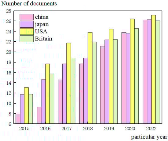 It can be seen from Figure 1 that there are many types of research in wireless sensor networks in the United States, the United Kingdom, and other Western countries. This situation depends on their computer technology development and communication technology development. China and Japan, two Asian countries, have also reflected the change in research quantity according to their development []. The advantages of a wireless sensor network lie in its low price, convenient deployment of nodes, and rapid data flow in a short distance. However, its most significant disadvantages are its limited energy, high maintenance cost, and poor storage and computing capacity.