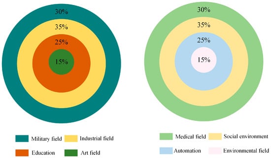 It can be seen from Figure 2 that ZigBee technology, as a high-performance wireless communication technology, is mainly used in military and industrial fields in Western countries. It is widely used in medicine, social environment, automation, and other fields in Asian countries. We analyzed the effect of using ZigBee technology in the United States in detail and found that they had carried out fusion applications since the smart sensor stage. At first, this kind of low-energy consumption wireless sensor was used in the military field []. The US Defense Department has provided financial support for wireless sensor networks and is determined to take sensor research as the long-term planning goal. Based on ZigBee technology’s high efficiency and low latency, the strategic communication network is optimized, which helps the information transmission between the front-line forces and the logistics forces []. Although this technology has developed rapidly in Western countries, Japan has also effectively combined ZigBee technology with intelligent society. They found that when intelligent transportation and intelligent furniture are integrated into the sensor network, they can improve the interaction between people and objects. At the same time, in the design of power-saving infrastructure, this controllable and low energy consumption technology is combined with the street lamp system to obtain a good optimization effect [].