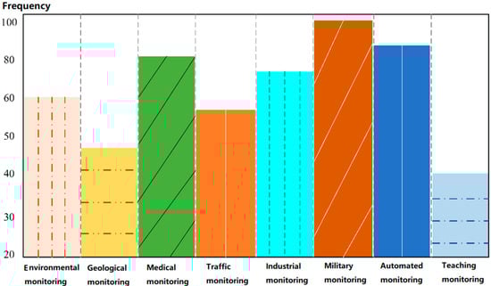 In 6G applications, the impact of the access side will be more and more far-reaching, and the requirements for the rate and delay of service applications will become greater and greater. The role of embedded cloud computing in wireless sensor network routing algorithms will also be more prominent []. The wireless sensor network is a communication network composed of an unfixed network topology. Daily, many monitoring areas are deployed with monitoring nodes formed by microsensor networks. These sensor nodes use frequency hopping to transmit signals and data and rely on cooperation between sensor nodes to complete data acquisition, sensing, processing, and other tasks []. Finally, network coverage sends the collected data and signals to the monitoring center in a dynamic transmission mode. In practical applications, wireless sensor networks do not need stable and specialized network support and can work quickly in any environment []. According to our research in the literature, the frequency of use of wireless sensor networks in various fields is shown in Figure 3.