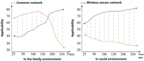 It can be seen from Figure 3 that wireless sensor networks are well used in military monitoring, medical health monitoring, and fire monitoring. With the construction of modern cities, wireless sensor networks are also used in the research of traffic management and road monitoring []. This new data and information processing mode has become the key research object in the monitoring field. The gap between wireless sensor networks and traditional networks is obvious. In the same data calculation process, if you want to ensure the quality of data transmission, select wireless sensor networks. Therefore, in the face of dynamic information in a complex network environment, wireless sensor networks have more advantages than ordinary networks []. We compare the applicability of the two networks from the user traces of family and society, as shown in Figure 4.