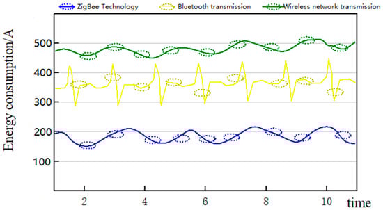 It can be seen from Table 1 that ZigBee technology is more flexible in terms of the scope of use of the network and can increase the coverage and communication distance at any time. We can find it under the same transmission distance. In terms of energy and power consumption, ZigBee technology can transmit more data information with less energy. To further reflect the advantages of ZigBee technology in terms of energy consumption, we compare the data transmission energy consumption of three wireless networks in the same time range, as shown in Figure 5.