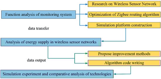 It can be seen from Figure 5 that ZigBee technology and the other two technologies consume significantly different amounts of system energy under the same data transmission volume. We can find these differences under the same transmission distances. As data are continuously transmitted, the energy consumption of transmission using ZigBee technology is the lowest of the three types of transmission and remains highly stable over time. ZigBee technology is more suitable for the purpose of low power consumption. If it is used in the monitoring system, the working time of the system can be extended. However, in order to meet the comprehensive coverage of the monitoring system, multiple sensor nodes need to be deployed. Each sensor needs to consume energy, and the total consumption has a heavy burden on the monitoring system. The data transmission of the network is also complex. If the network is blocked, the battery energy consumption will be accelerated. Therefore, we need to design an energy-optimized routing algorithm based on ZigBee technology to improve the energy supply effect of the system. The main optimization process of this study is shown in Figure 6.