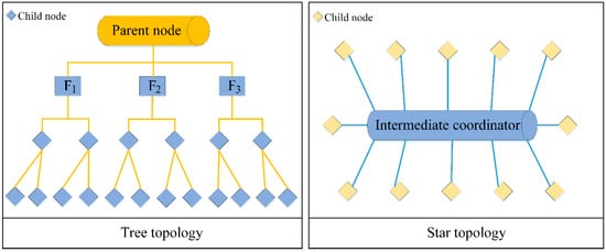 It can be seen from Figure 7 that the tree network is a special structure in a ZigBee wireless network system. Each sensor node is based on the parent node and completes network deployment through the distribution of child nodes. However, this structure has high requirements for the central parent node, and the failure here is likely to cause the entire network to be paralyzed. The star network takes the intermediate coordinator as the core, connecting all sensor nodes with the coordinator. Each subnode cannot complete the data transmission task, and can only upload to the central controller for forwarding. Although this network structure is relatively simple, it also depends on the working state of the central coordinator. Therefore, we removed the above two types from the ZigBee network selection and choose a topology scheme that combines mesh structure with tree structure. During data and information transmission, resource sharing is realized through node interconnection, and the combination between points is realized according to the topology structure, which is more suitable for monitoring systems under wireless sensor networks from scalability to use cost []. After analyzing the network structure of ZigBee technology, we analyze its network address allocation in detail. Assuming that the maximum number of child nodes that can be connected in the network node is fixed, and the number of routes is Cx, the address offset can be obtained according to the following formula: