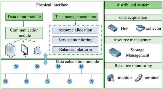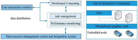 It can be seen from Figure 8 that the internal architecture of the platform is composed of a user interaction window, data calculation, task management, system monitoring, resource management, and other modules. Among them, the server integration group also includes the label of the host and motherboard models, connecting the chip with the board according to the embedded system model. To enable the data monitoring system to cover a broader range, we also need to deploy nodes with the help of wireless sensor networks and set up connection points at each key location in public places. The energy optimization improvement of ZigBee technology has been carried out for the wireless sensor network above to reduce the energy consumption of the monitoring system in actual operation. This composite embedded cloud computing system is characterized by high real-time, low power consumption, simple deployment, and high connectivity with sensor nodes. At the same time, this system’s distributed real-time computing capability can process a large amount of information in the monitoring data. We show the real-time data processing framework and the distributed system structure, as shown in Figure 9.
