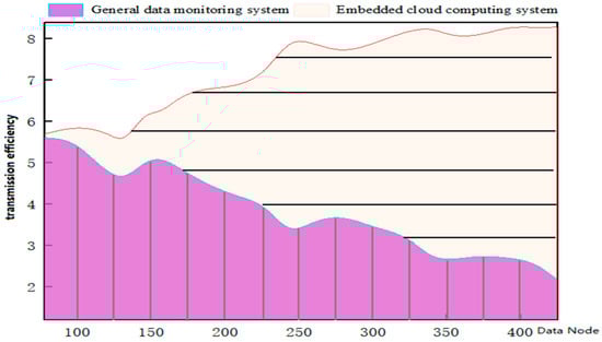 According to the above formula, we ran the data monitoring system in practical applications and found that the running speed of embedded cloud computing was significantly improved. We compared the efficiency of ordinary data monitoring systems and the embedded cloud computing system in multi-task and multi-node data transmissions, as shown in Figure 10: