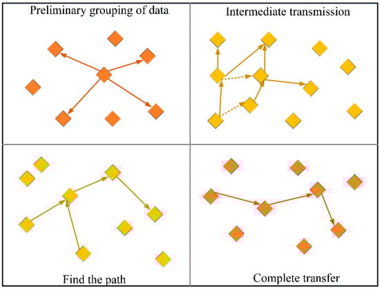 As shown in Figure 11, the schematic diagram shows four modes of primary data grouping, intermediate transmission, pathfinding, and transmission completion. After receiving the packet data, each sensor node first judges whether there is the same type of data information as the root destination node, and the transit node sends the data in packets. If there are traces of history, it is optional whether to re-establish the path or to complete the transmission according to the historical path. If the sensor node does not find a suitable route and path, it immediately sends a broadcast request to other parts to find the destination. Therefore, the routing transmission path selected by this algorithm is the minimum consumption path for system operation and has a good effect on the application of large-scale wireless sensor networks. We compared the performance of the three transmission modes of the clustering routing algorithm, AODVjr algorithm, and fusion algorithm in terms of energy consumption, response time, transmission efficiency, etc., as shown in Table 2.