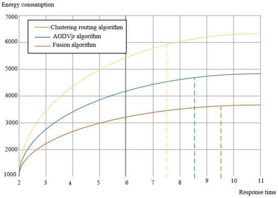 Table 2 shows that the energy consumption of the clustering routing algorithm and AODVjr algorithm is medium, while the energy consumption of the fusion algorithm is the minimum. At the same time, the three algorithms are further analyzed in terms of energy consumption, as shown in Figure 12.