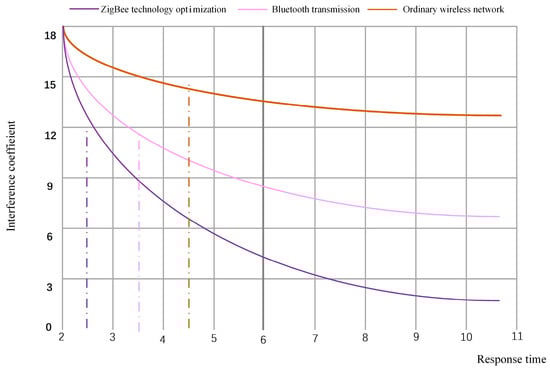 It can be seen from Figure 13 that there are apparent interference effects when the response time of ordinary wireless networks and Bluetooth transmission reaches 2 S. The wireless sensor network optimized by ZigBee technology has a longer anti-interference time and more obvious advantages than the other two. This research not only makes a comparison of multiple routes in terms of energy consumption but also shows a clear distinction in terms of data transmission efficiency and transmission accuracy. Therefore, it proves that a ZigBee energy-optimized wireless sensor network can be effectively applied in the data monitoring system.