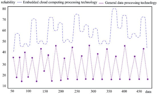 It can be seen from Figure 14 that the monitoring layout nodes of a certain urban area are randomly selected, and the network system formed by the monitoring nodes is displayed using virtual simulation software and a satellite positioning system. We find that in modern urban construction, the distribution of monitoring systems is becoming larger and larger, and each node is connected with the other. In this dynamic data environment, embedded cloud computing processing can carry a large amount of computing workload. In providing data analysis services for monitoring users, embedded cloud computing technology also has strong reliability. It can not only protect the effectiveness of data transmission but also maintain system security and reduce the probability of external intrusion. At the same time, the restrictions of time and space are broken to realize the sensing connection within the region and city. This data monitoring system can complete data transmission across regions and platforms and has obvious advantages in target searching, character screening, target tracking, and other functions. We used the virtual simulation network to compare the embedded cloud computing processing with the ordinary data processing technology, and analyzed the data transmission reliability of the two in the process of monitoring the change in information volume, as shown in Figure 15.