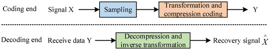 Light-field imaging has become a technology that can obtain more abundant visual information. Traditional photography captures the two-dimensional projection of light in the scene [2]. In contrast, light-field imaging collects light brightness in all directions through angle domain integration and decomposes angle information lost in traditional photography. On the one hand, this high-dimensional visual data representation provides a powerful capability for scene understanding and improves depth perception, refocusing after capture, video stability, and other performance of traditional computer vision. On the other hand, the high dimension of the optical field also brings new challenges to data capture and data compression. If we want to further apply light-field imaging technology to production and life, we need to solve the problem of image data coding. In traditional signal processing theory, signal processing generally needs to go through four processes: sampling digitization, compression coding, storage and transmission, and recovery and reconstruction, as shown in Figure 1. Nowadays, people have higher and higher requirements for images, videos, and other data. Such sampling will generate massive data, which brings not only great pressure to signal storage and transmission but also great challenges to hardware acquisition equipment [3]. In addition, after we transform all the sampling values, we only retain a small proportion of the large coefficients and discard most of the remaining small coefficients when encoding and transmitting, which is undoubtedly a waste of computing resources.