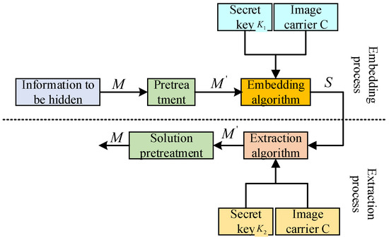 On this basis, the generalized model of image hiding is shown in Figure 3. The general model of image hiding includes the embedding process, the transmission process, and the extraction process of the information to be hidden. The embedding process of image hiding should first preprocess the information M to be hidden (such as encryption or spread spectrum, etc.) to obtain the processed message M. Then, using the key and hiding it into the image carrier C through a specific embedding algorithm, the hidden information S is obtained. During the transmission process, the information S may be illegally intercepted by a third party and re-sent after malicious processing. The receiver uses the extraction algorithm and the key corresponding to the embedding algorithm to extract the hidden information from the hidden information S to obtain the message and then obtain the original message M through de-preprocessing. In general, private key information is used to achieve hiding, .