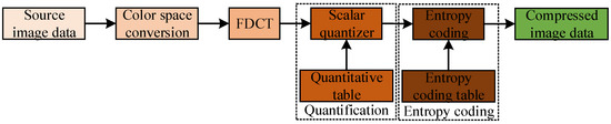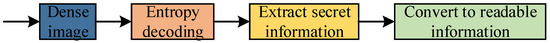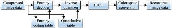 Among them, the secret information is further compressed through entropy coding and other operations, and then the encrypted image is obtained in JPEG format. The extraction of the secret information is just the opposite of the embedding process in Figure 13. First, the corresponding entropy decoding is performed on the encrypted image in JPEG format, and the quantized DCT coefficient matrix is obtained with the secret information hidden. Then, according to the corresponding extraction algorithm, the secret information is extracted from the DCT coefficient matrix.
