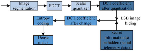 With the rapid increase of image transmission information and the increasing tension of channel resources, it is believed that the low-frequency and important image transmission information obtained with parameter sensors and the broadband image information obtained with image sensors are hybrid transmissions based on image hiding. In view of the separation of multi-sensor image transmission data at the receiving end and the large amount of image data information, the image transmission data obtained using a multi-sensor before mixed transmission is subject to frame synchronization preprocessing and image compression coding. The specific multichannel image transmission data mixed-transmission design scheme is shown in Figure 2.