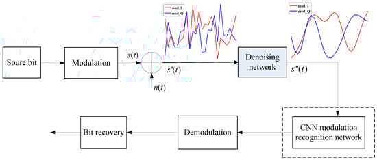 where is the modulation signal with IQ components and generated at transmitter and represents zero-mean complex AWGN vector with variance in each signal dimension. When the noise interference is serious, the received signal quality is very poor, which will badly affect the demodulation performance. In this case, the noise reduction needs to be performed before subsequent processing. In the cooperative communication scenario, the modulation type is known in advance for the receiver, thus the denoised signal will be demodulated directly. For the application of non-cooperative communication, the receiver does not know the current modulation type, thus it needs to firstly perform modulation recognition, as shown in the dashed box in the Figure 1. We chose the automatic modulation classification (AMC) module proposed in [] to finish the modulation recognition.