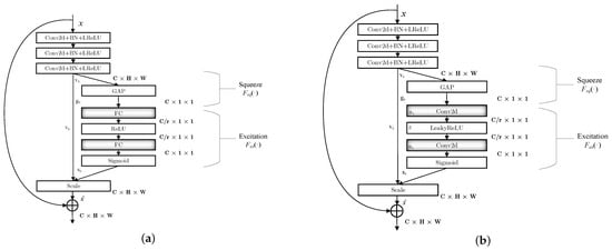 The Squeeze-and-Excitation Deep Residual Network (SE-ResNet), as the champion model of Imagenet 2017, is very similar to the Deep Residual Network (ResNet). However, it adds an SE module so that the information between the channels can be exchanged, thereby improving the performance of the network. Figure 3a depicts the original SE-ResNet module. We modify the SE unit in SE-ResNet and use the improved SE-ResNet to establish the encoding and decoding blocks. That is, the fully connected layer (FC) in the original SE unit is replaced by a convolutional layer. This can be attributed as follows. (1) The SE-ResNet was originally designed and implemented under the Caffe framework, in which the FC supports the input of data dimension . However, the deep learning framework Pytorch used in this paper does not support the input of data with the same dimension. When the FC is used in the model, both the input and output data require dimension transformation, i.e., three-dimensional data should be reduced and flattened into one-dimensional data C as the input of the fully connected layer. It will increase the computational complexity of the model and destroy the spatial structure of the data, leading to the loss of feature information. This problem can be addressed by replacing the FC with a convolutional layer. (2) Both the convolutional layer and FC perform a dot product operation on the feature maps, thus they have the same functional form. That is, the convolutional layer can be used to replace the FC without changing the function operation of the SE module itself. In addition, since the value of the modulation signals is bipolar with positive and negative numbers, we choose LeakyReLU as the activation function. The improved SE module, as shown in Figure 3b, mainly consists of the following two parts.