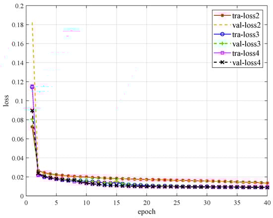 where s is the same as before, and represents the signal-reconstructed value (predicted value). In the first experiment, we determine the optimal depth of encoder-decoder modules. We design three encoder module structures, whose encoder-decoder depths equal 2, 3, and 4, respectively, and the corresponding neural networks are called DRdA-CA2, DRdA-CA3, and DRdA-CA4, respectively. The training loss and validation loss of the three network models are shown in Figure 5. The detailed value of the training loss with different epochs and the numbers of parameters are listed in Table 3. In terms of the training loss, DRdA-CA3 is 1.4–1.9% lower than DRdA-CA2 on average when the epoch is larger than 10, and the validation loss presents a similar trend. It should be noted that the performance of DRdA-CA3 and DRdA-CA4 is almost the same. When it comes to the complexity, the size of the model parameters of DRdA-CA2, DRdA-CA3, and DRdA-CA4 are 181 k, 263 k, and 345 k, respectively. Therefore, considering both the loss and model complexity, we choose DRdA-CA3 as the neural network model structure for the denoising tasks. Although the loss values have been small at the epoch equaling 10, they continue to decline and basically stabilize at 40 rounds. In this paper, the model parameters adopt the training results of 40 rounds.