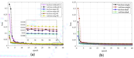 In the proposed DRdA-CA, “dual” represents the residual connections added not only between different encoding (decoding) blocks but also inside the encoding (decoding) blocks of different depths, so it is called “dual”. In contrast, “single” refers to the residual connection only existing inside the encoding (decoding) block, and each encoding (decoding) block is the improved SE-ResNet module, which contains one residual connection. In order to demonstrate the advantages of “dual residual connections”, one of the main innovations, we have also conducted an ablation experiment based on the control variable method, comparing it with the “single residual connection” method, where the residual connection only exists inside the encoding (decoding) block. The loss curves are given in Figure 6b. As shown in the figure, the dual residual model achieves a lower training loss and validation loss than the single residual model. When the epoch increases to 40, the validation loss of the dual residual connections is only 50% of that of the single residual connection. Comparing Figure 6a,b, apparently, both the improved SE module and dual residual connections play an important role in improving denoising performance, and dual residual connections are more effective.