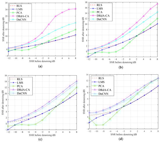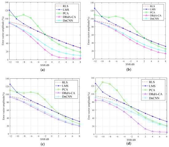 Figure 8a–d also show the EVM curves of the above four modulation signals processed using different noise reduction methods. The lower the EVM, the better the noise reduction performance. As seen from Figure 8, the EVMs obtained using the two deep learning-based denoising methods are significantly lower than those obtained using the other three traditional denoising methods. After PCA denoising, the EVMs of the signals do not steadily decline with the increase in the SNR, which indicates that the robustness of PCA is poor. The signal EVM curves obtained after RLS and LMS denoising are close to each other when the SNR is greater than 4 dB. However, when the SNR falls in −12 dB∼4 dB, RLS is better than LMS. The deep learning algorithm DnCNN performs better than the three traditional algorithms do, and the proposed DRdA-CA makes a better achievement in denoising than DnCNN does.