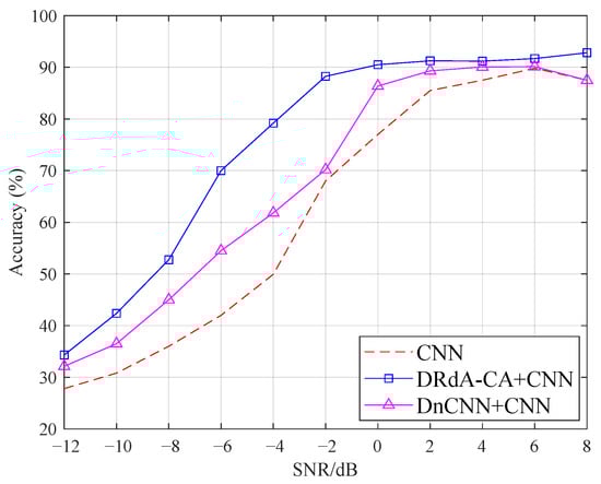 The experiment schemes are as follows. (1) The CNN model is used for AMC directly, denoted as CNN. (2) The DnCNN method is used to reduce the noise of modulation signals, and then CNN is used for AMC, denoted as DnCNN+CNN. (3) The proposed DRdA-CA is used to decrease the noise, followed by CNN for AMC, denoted as DRdA-CA+CNN. Figure 9 displays the average classification accuracy of all the modulation modes for three different schemes. The modulation recognition accuracy is greatly increased when using denoising methods based on deep learning. The DRdA-CA method clearly outperforms the DnCNN method. When the SNR varies from −12 dB to 8 dB, compared with the non-denoising scheme, the scheme with DnCNN denoising improves the average classification accuracy by 0.01%∼12.5%. After using the proposed denoising approach, the average classification accuracy is increased by 1.88%∼29.25%. Compared to the DnCNN denoising method, the proposed DRdA-CA makes the average classification accuracy increase from 67.59%∼74.94% over the entire SNR range, which further shows the superiority of the proposed method.