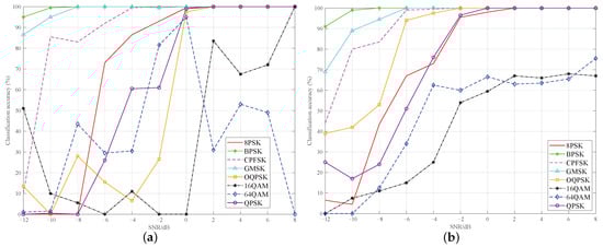 Figure 10a,b give the recognition accuracy of each modulation type with the latter two schemes. As seen in Figure 10a, after DnCNN denoising, the recognition accuracy of the three low-order modulations, BPSK, GMSK, and CPFSK, is relatively high, and almost reaches 100% under the SNR of −4 dB. This is because these three types are low-order modulations and the patterns of the signals are simple and significantly different from those of the high-order PSK and QAM. Therefore, their classification accuracy is also high, even through general DnCNN denoising.