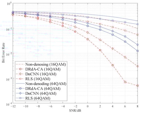 In order to further verify the performance of the proposed DRdA-CA, the demodulation experiments after denoising have also been done. We present two higher-order modulation modes, 16QAM and 64QAM, since their demodulations are more challenging in the low SNR range for practical communication systems. The RLS algorithm with better performance in the traditional methods and the DnCNN are selected as the comparison methods. Figure 11 shows the BER curves of demodulation for the 16QAM and 64QAM signals after denoising with different methods.